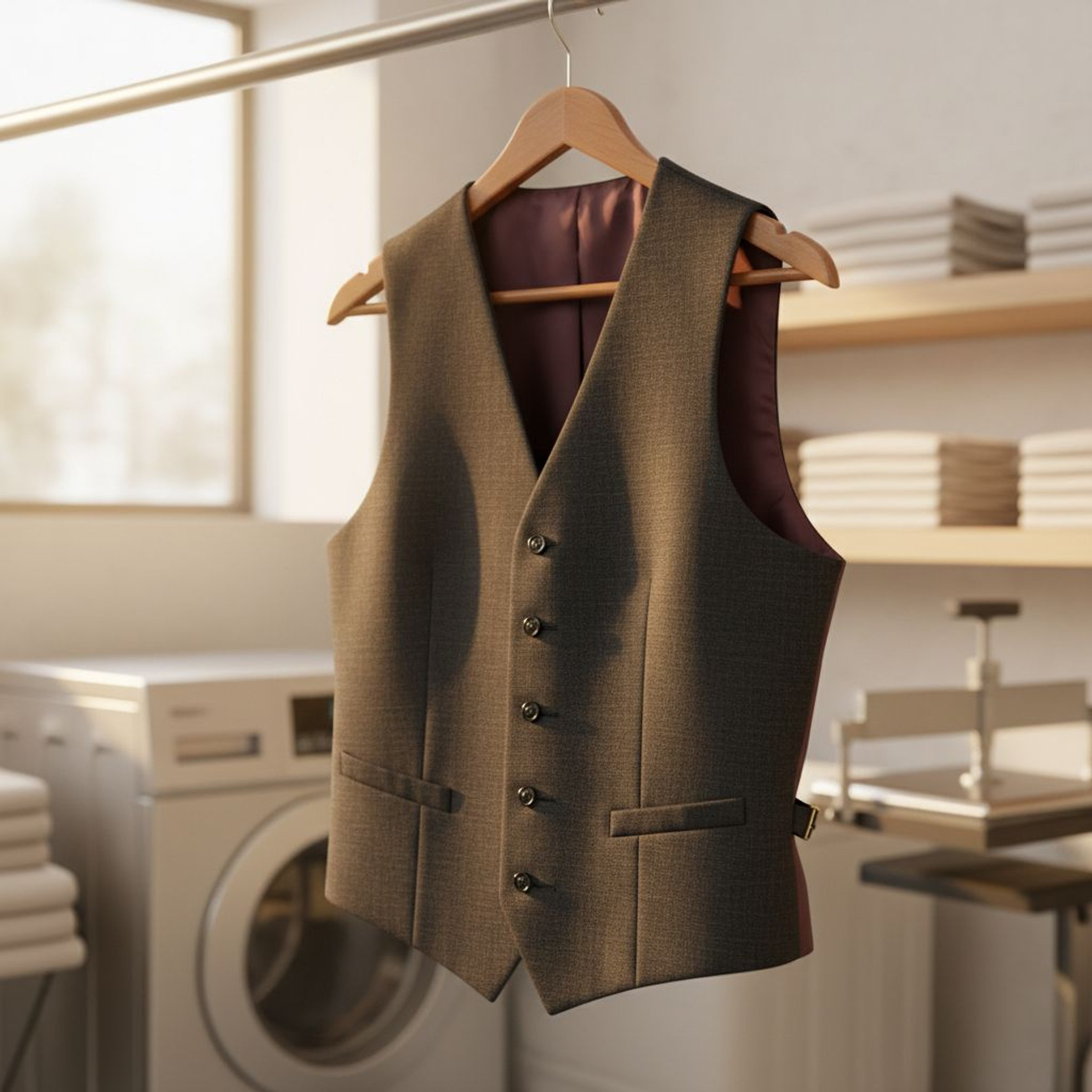 Костюмна камізелька має клейовий вкладиш, який тримає форму. Температура вище 40°C і віджимання відклеюють його від тканини. Результат: бульбашки спереду, які не виправити. Нова клейова основа у кравця коштує дорожче за нову камізельку.